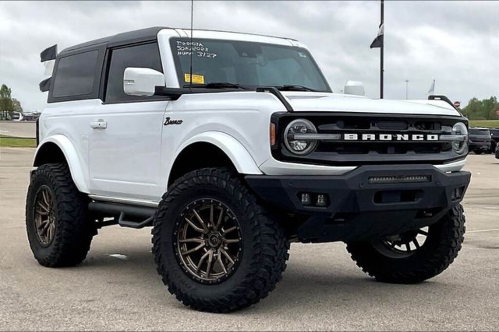 Equipment Group 313A High Package (12" LCD Capacitive Touchscreen w/Swipe Capability, 360-Degree Camera, Additional Sound Deadening, Front Parking Sensors, Information on Demand Panel, and Sideview Mirrors), Bronco Outer Banks Advanced, 2D Sport Utility, 2.7L EcoBoost V6, 4WD, 18" Bright Machined Aluminum Wheels, ABS brakes, Compass, Convertible HardTop, Electronic Stability Control, Exterior Parking Camera Rear, Fully automatic headlights, Heated door mirrors, Illuminated entry, Low tire pressure warning, Navigation System, Remote keyless entry, Security system, Speed control, Traction control, 4-Wheel Disc Brakes, 7 Speakers, Air Conditioning, AM/FM radio: SiriusXM with 360L, AM/FM Stereo, Auto High-beam Headlights, Brake assist, Convertible roof lining, Delay-off headlights, Driver door bin, Driver vanity mirror, Dual front impact airbags, Dual front side impact airbags, Emergency communication system: 911 Assist, Front anti-roll bar, Front Bucket Seats, Front Center Armrest, Front reading lights, Front wheel independent suspension, Glass rear window, Integrated roll-over protection, Occupant sensing airbag, Outside temperature display, Overhead airbag, Overhead console, Panic alarm, Passenger door bin, Passenger vanity mirror, Power door mirrors, Power steering, Power windows, Radio data system, Rear window defroster, Rear window wiper, SiriusXM Radio w/360L, Split folding rear seat, Steering wheel mounted audio controls, SYNC 4, Tachometer, Telescoping steering wheel, Tilt steering wheel, Trip computer, and Variably intermittent wipers.
